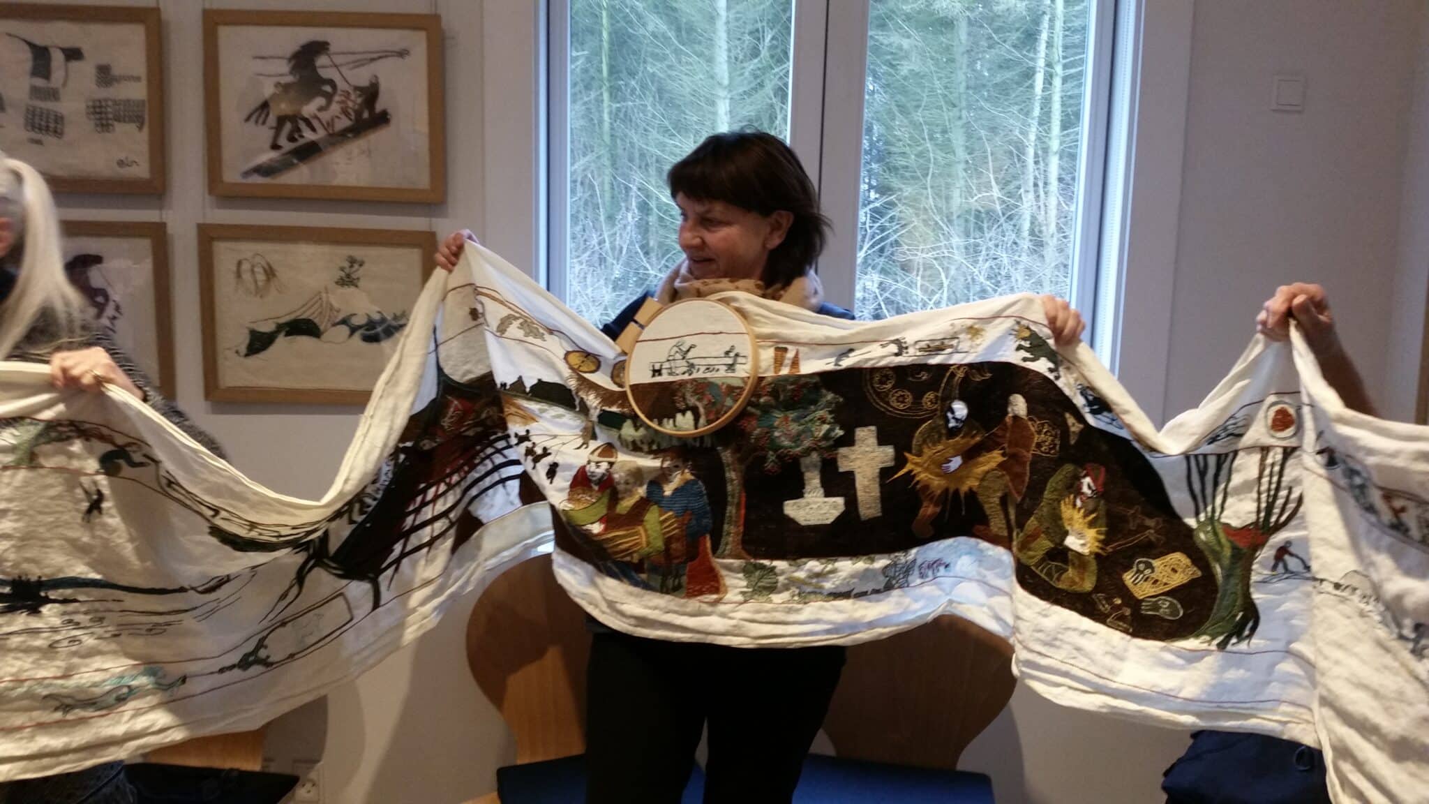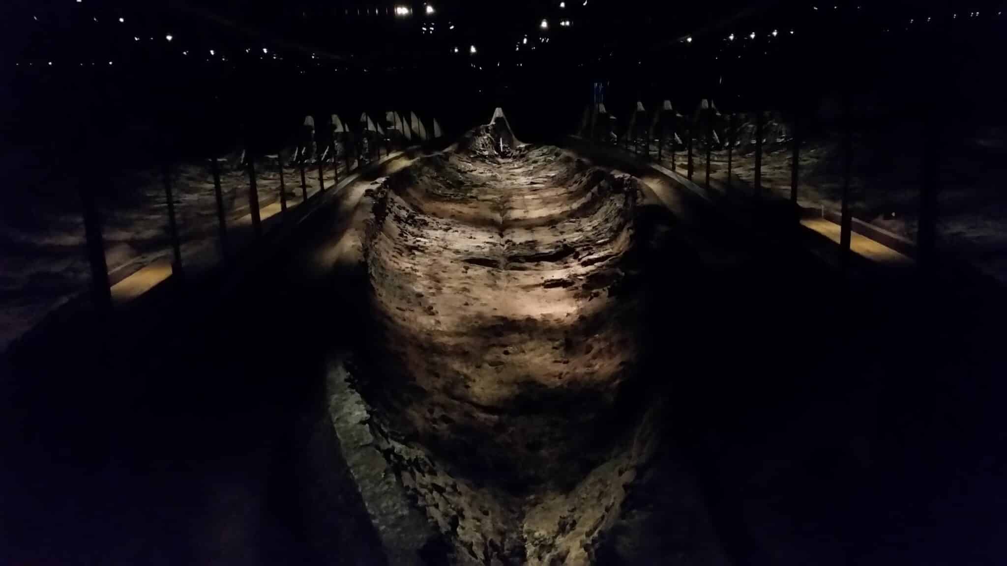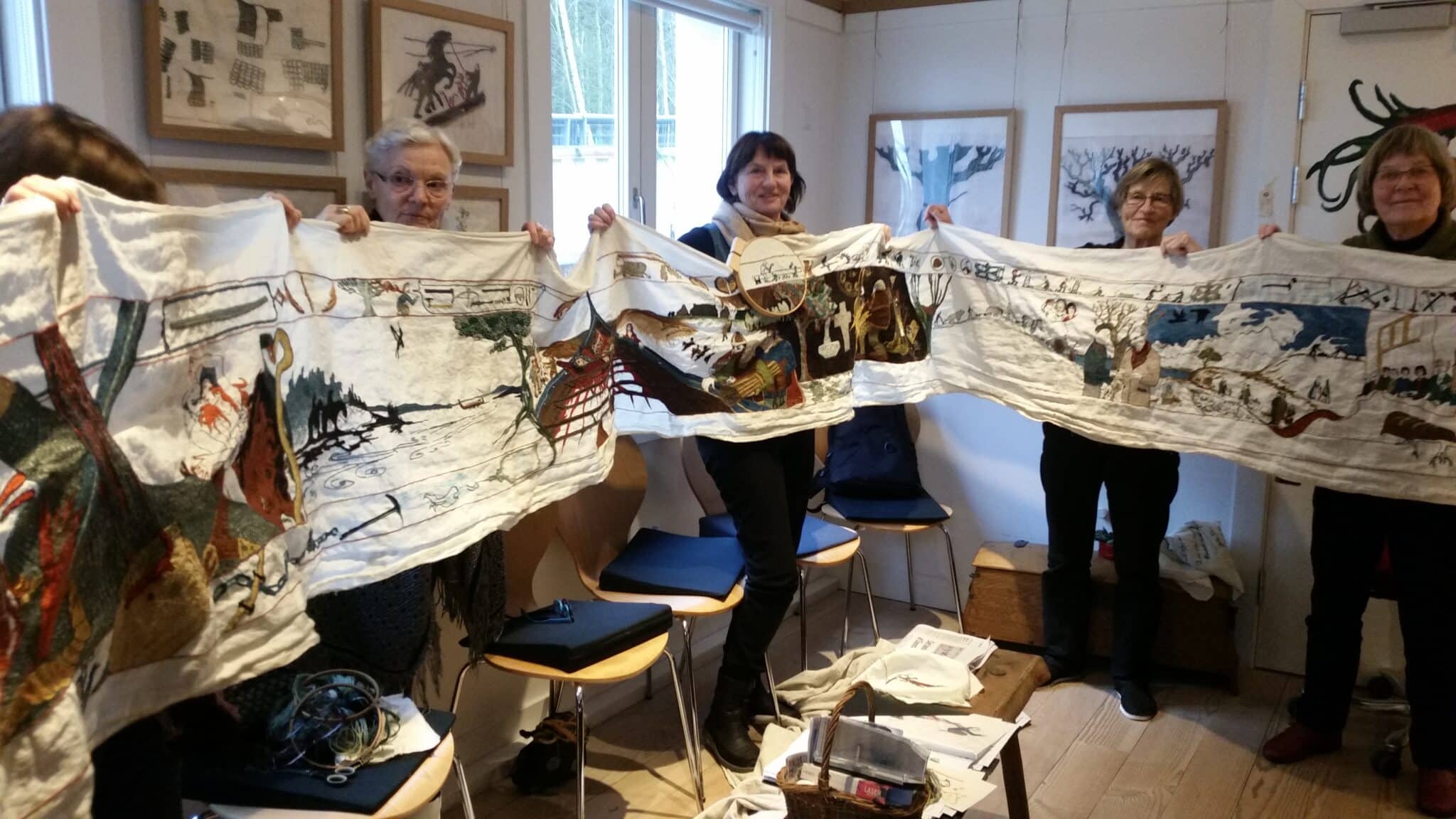Ladbyskibet blev vores redning på en iskold og blæsende dag. Så efter lidt fluebinding pakkede vi hurtigt sammen og kørte til Ladby. Vi var heldig at se de damer, der arbejder på det 7 m. lange tæppe, der skal hænge på væggen. Tæppet fortæller historien om Ladbyskibet